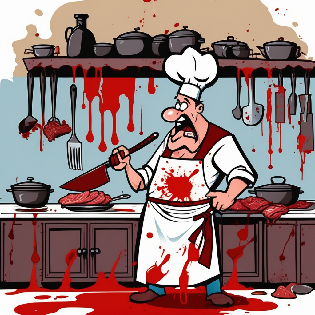 "The chef's sanguinary approach to preparing steak involved way too much red sauce."