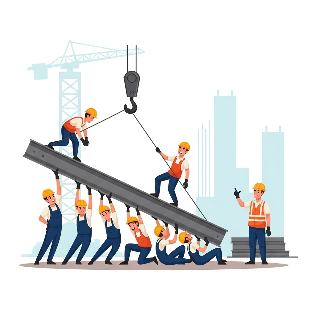 팀 리더가 무거운 철 구조물을 함께 들어 올리는 작업자들의 움직임을 조율한다.