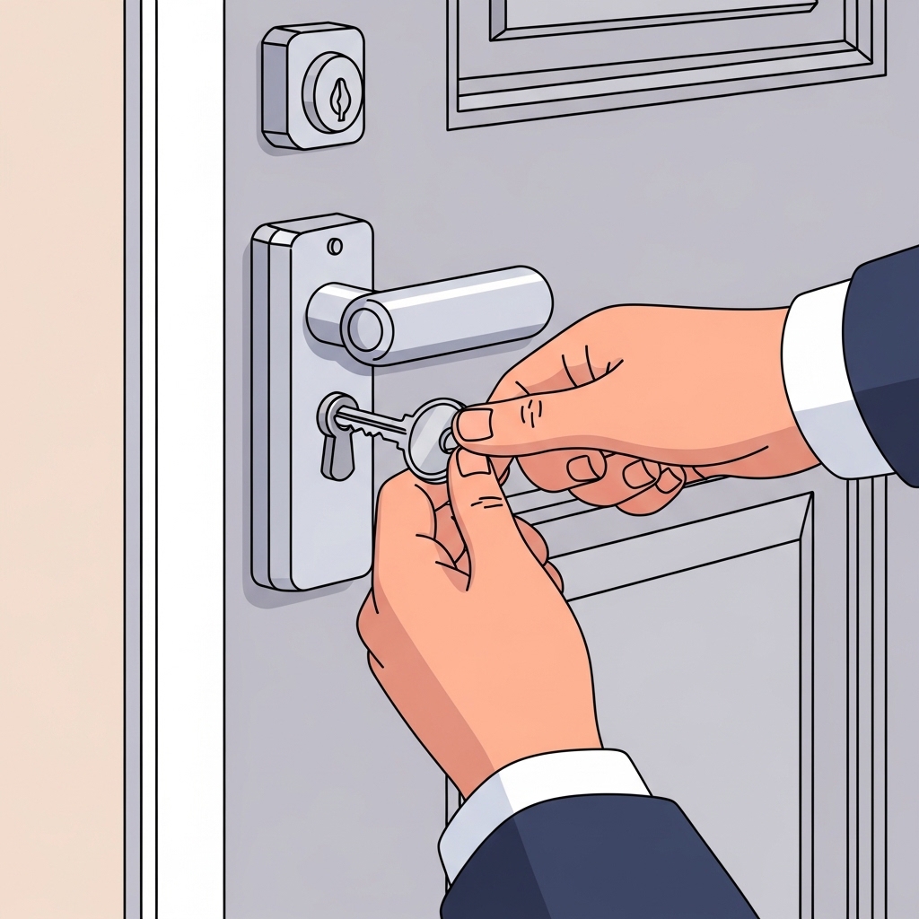 그는 열쇠를 자물쇠에 끼워 넣고 돌린다.