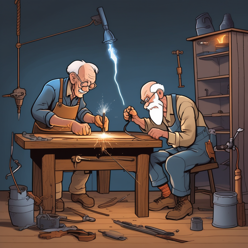 The elder organizes his folder while the welder sparks with fire!