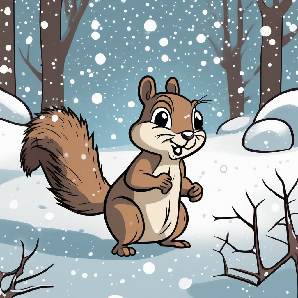 Through snow flurries, away go worries as the squirrel scurries!