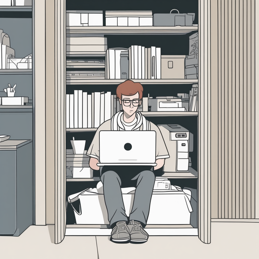 인턴은 책상과 의자가 겨우 들어가는 비좁은 공간에서 일하게 되었다.