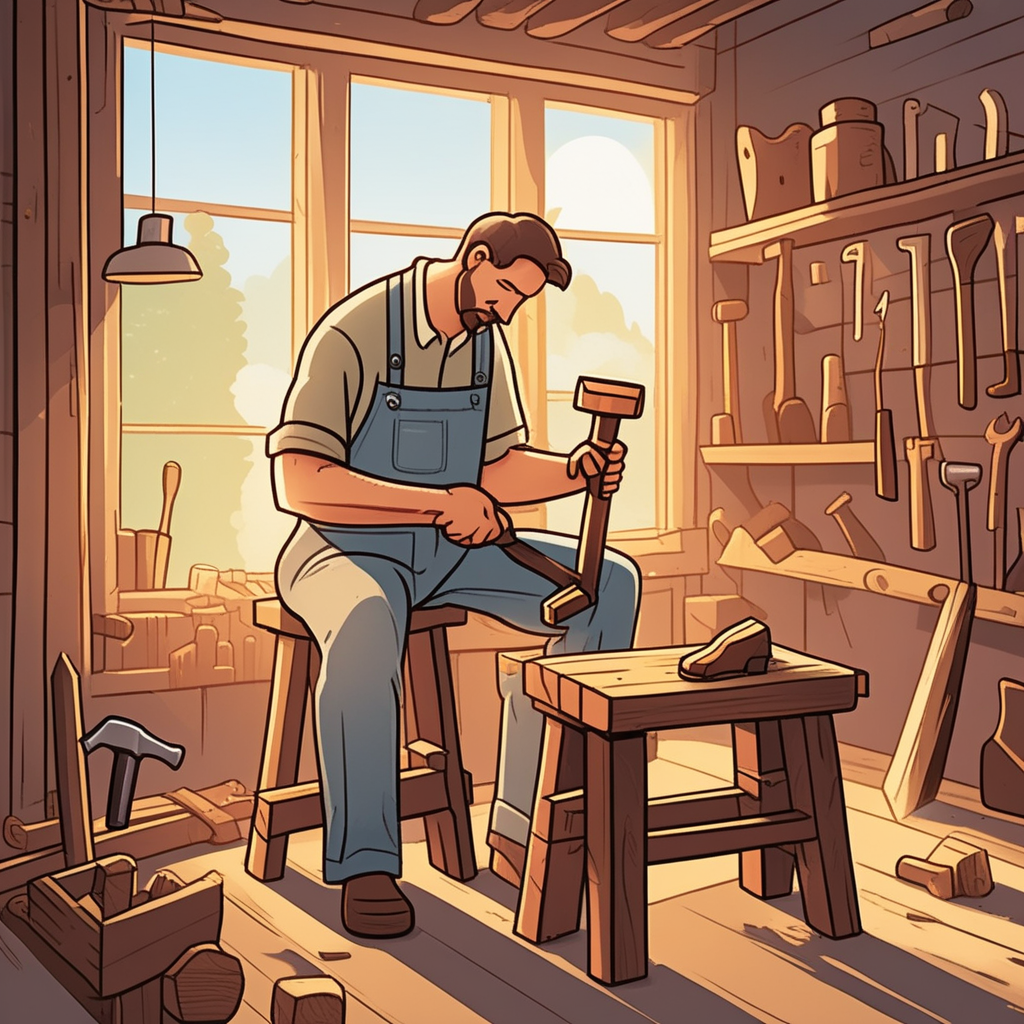 Sitting on a stool, reaching for his tool, in the morning air so cool.