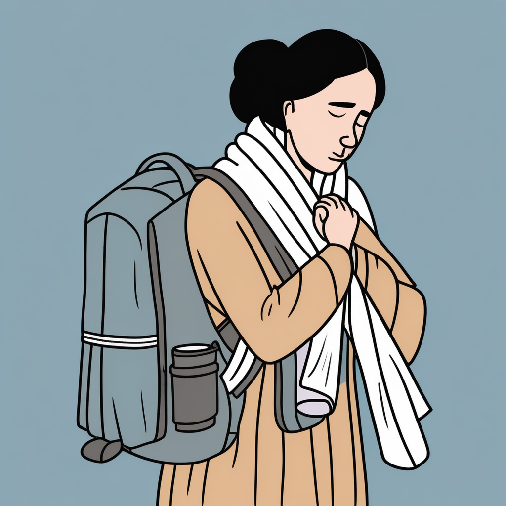 "She tied the broken shoulder strap with a shoelace as an emergency fix."