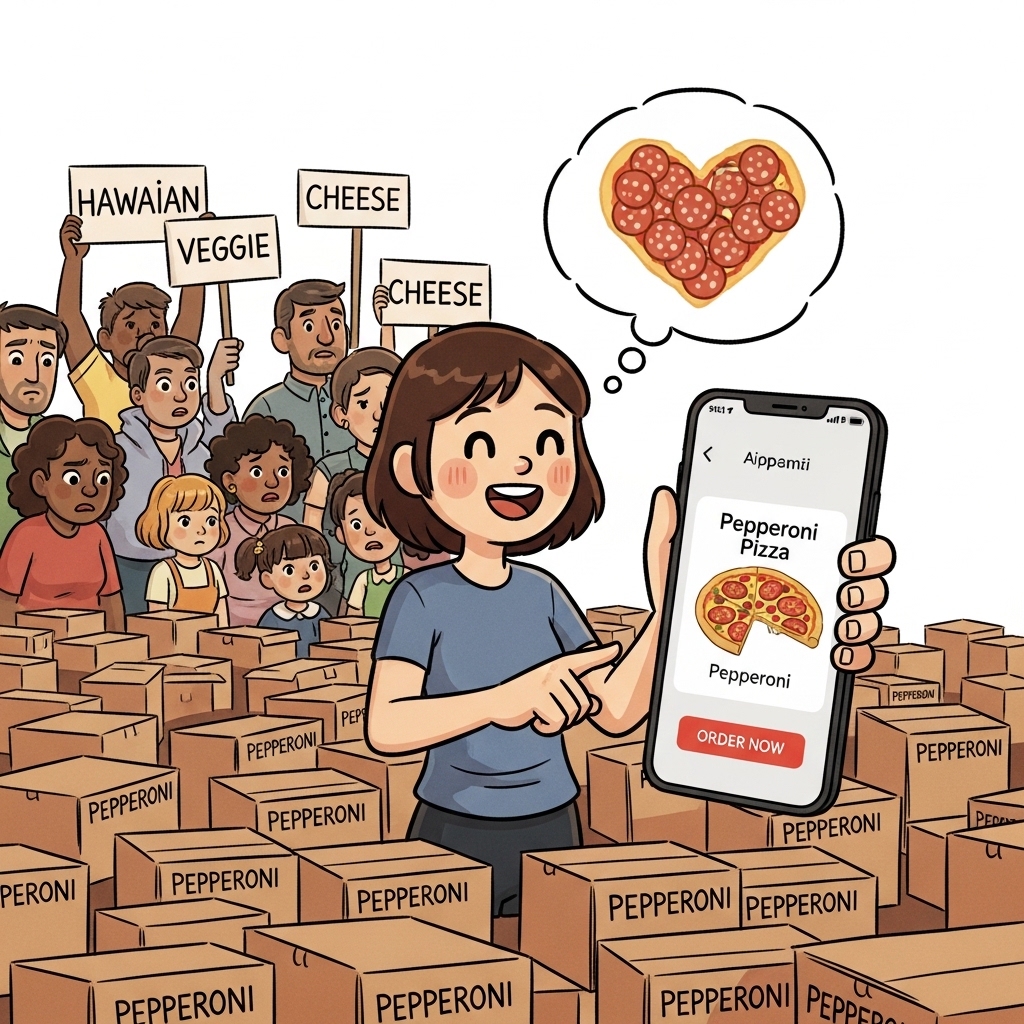 “시리가 또 우리 대신 피자를 사려고 했어 — 마치 페퍼로니만이 유일한 친구인 것처럼, 완전 페퍼로니 편향이야.”