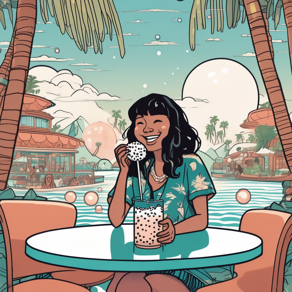 태평양 카페에서 피오나가 쫄깃쫄깃한 타피오카 펄을 씹고 있어요!