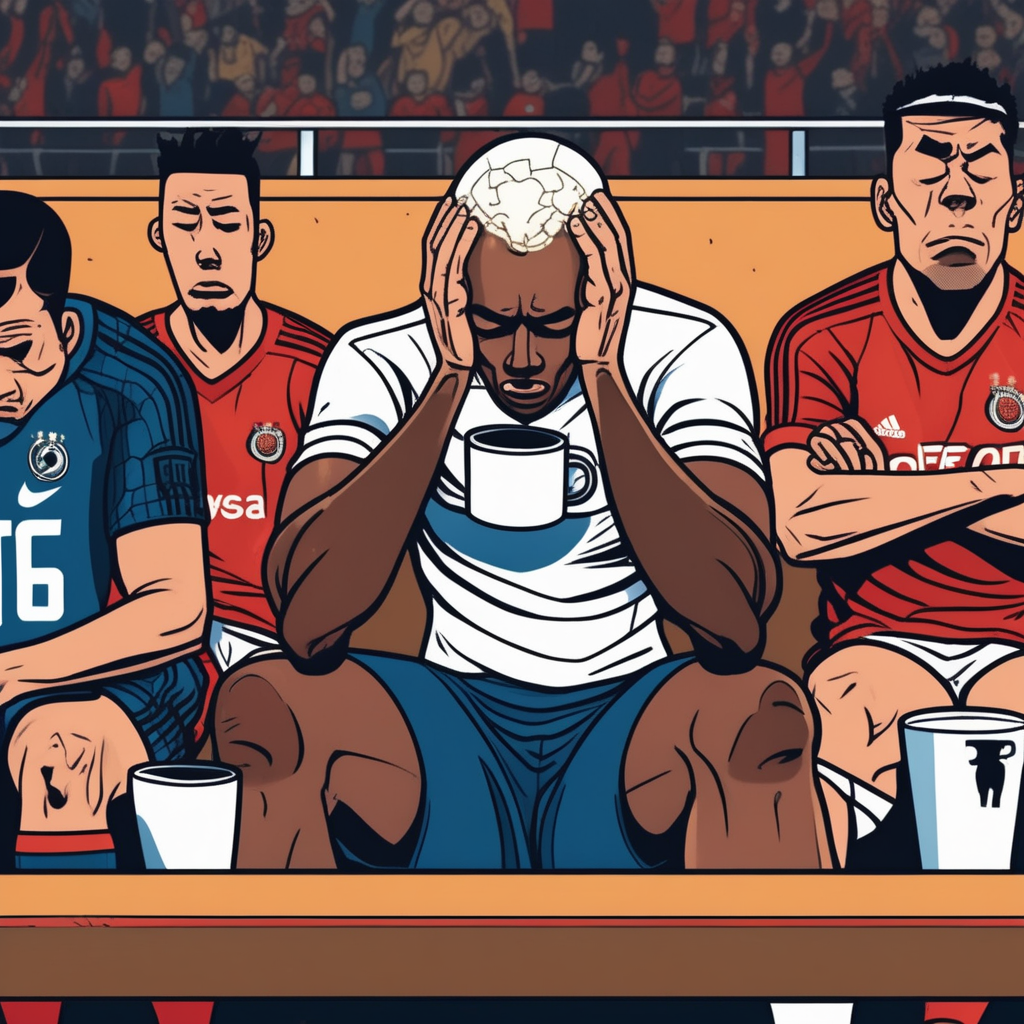 Stressed striker drinking coffee to calm down after missing goals!