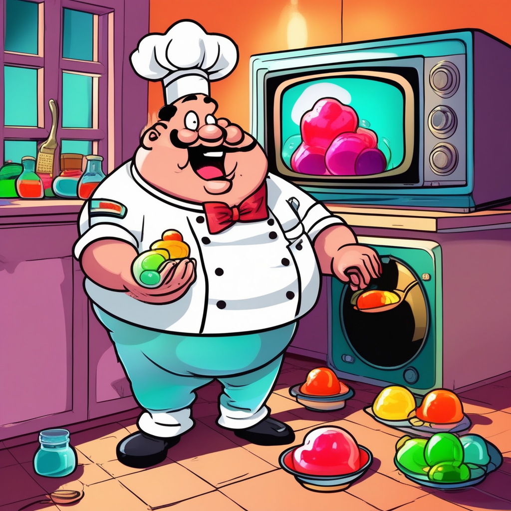 With his round belly, he eats jelly while watching the telly