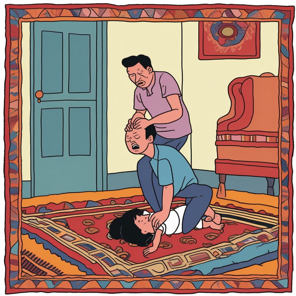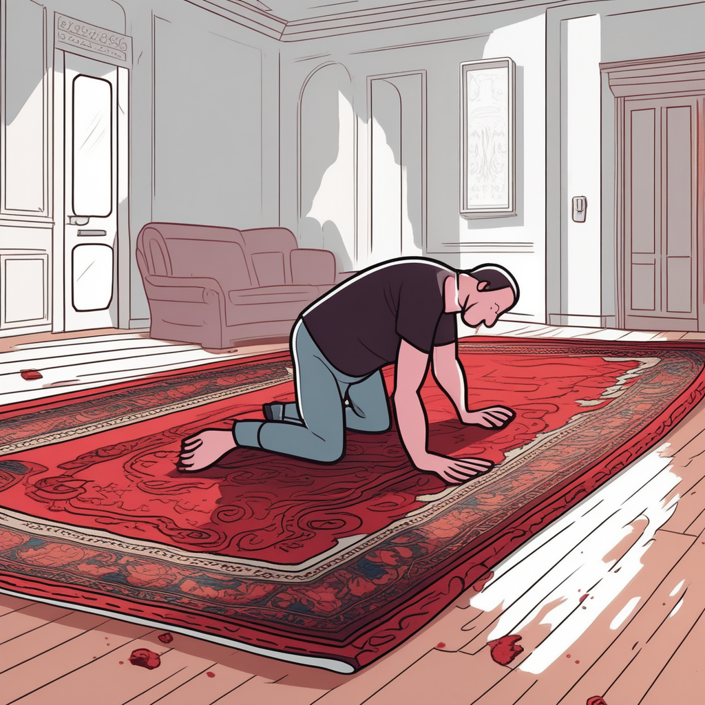 Lugging the heavy rug with a grunt - 'lug'!