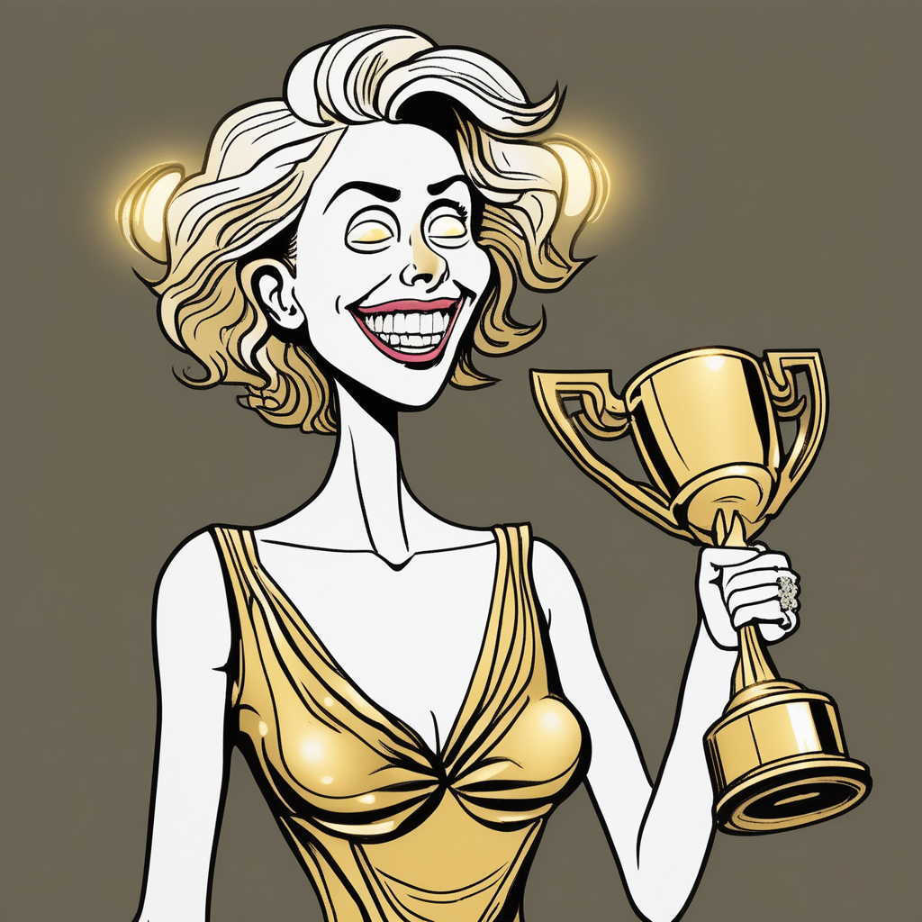 플라스틱 트로피를 들고 '정말 환상적!'이라며 비꼬는 표정