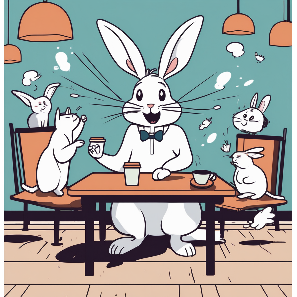 토끼가 커피숍에서 끊임없이 수다떨고 있어요! 토-커는 정말 말이 많네요!