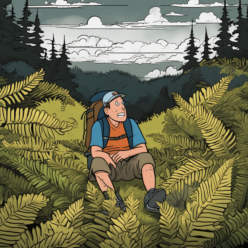 고사리 숲에서 걸음이 느려지고, 하늘은 어두워진다.
