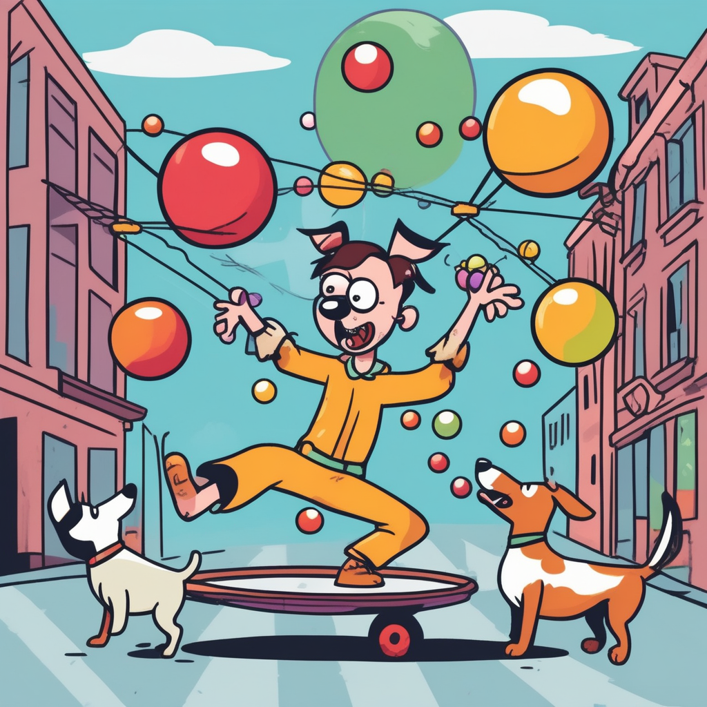 Juggling while struggling, with a dog wiggling below!