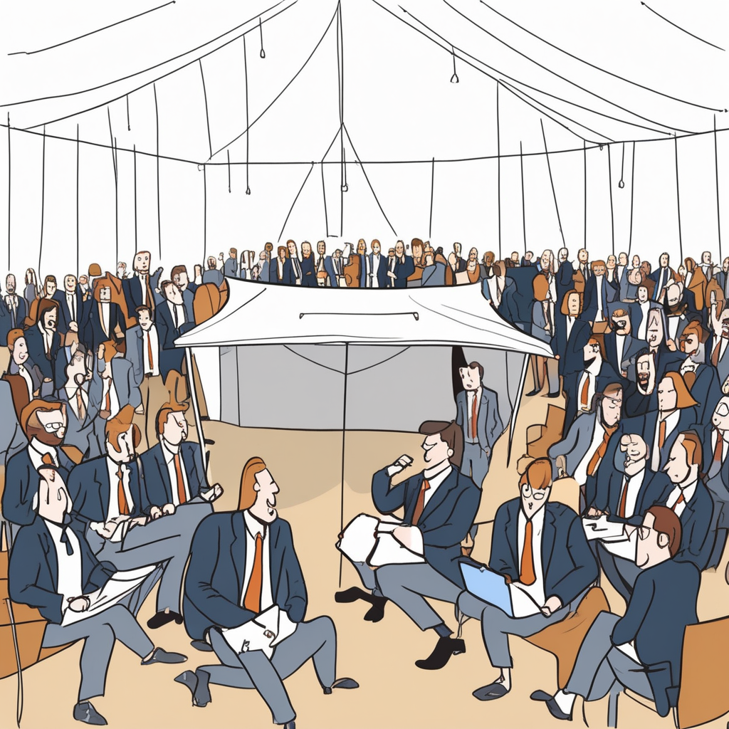 어! 텐트에서 회의 참석자들이 우르르 나온다!