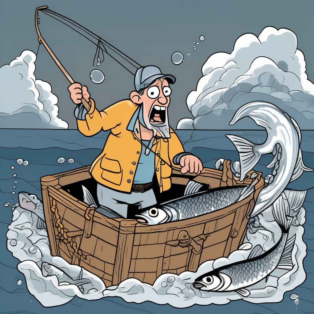 어부는 고등어 세 마리를 잡았지만, 한 마리는 완벽한 배영으로 물속으로 다시 도망쳤다.