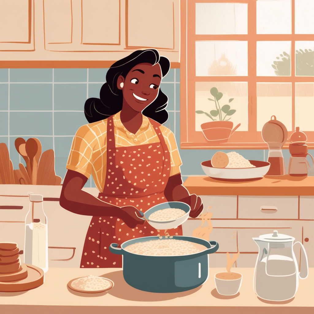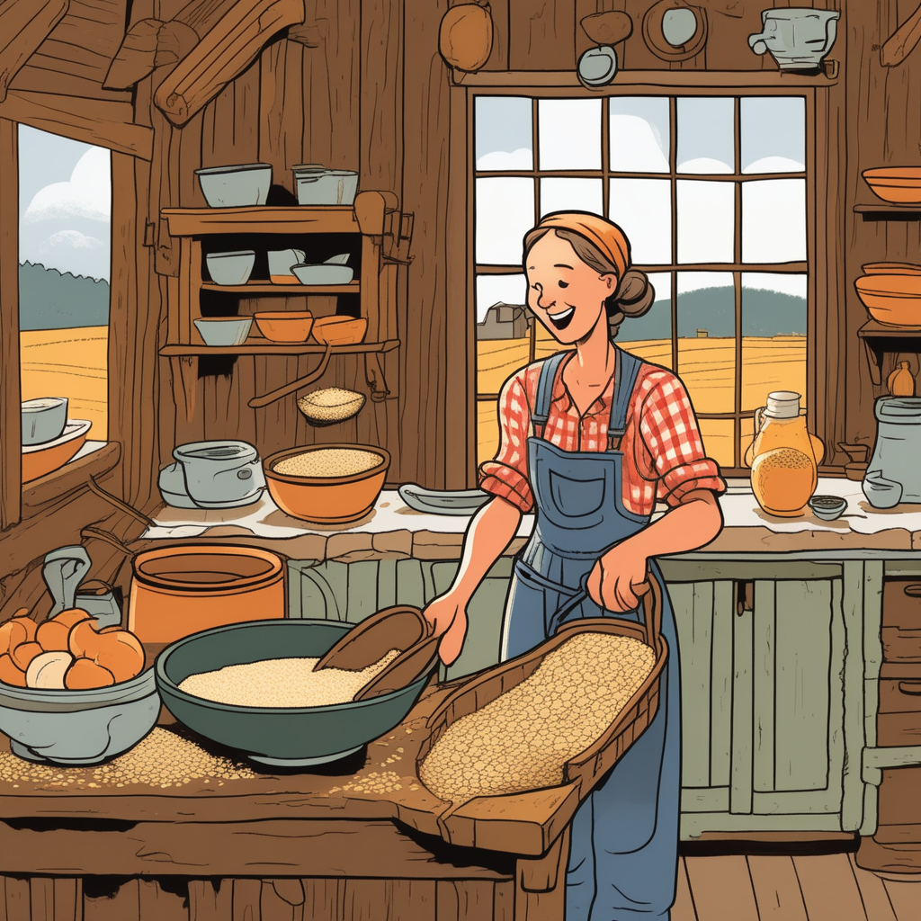 Mix oatmeal with cornmeal, while the old cartwheel watches the morning meal