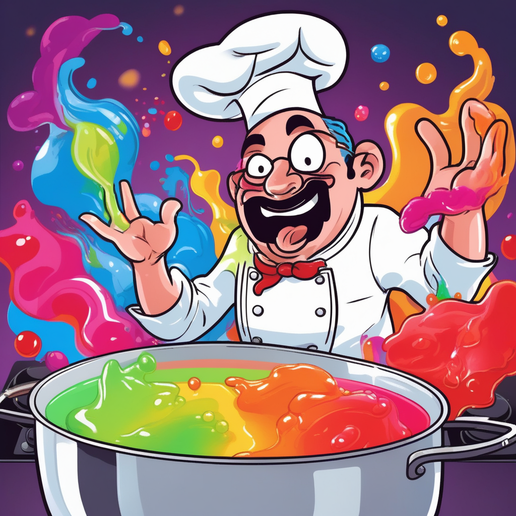 젤로 만들기에 완전히 빠진 요리사가 슬슬히 재료를 넣으며 열정적으로 요리중!