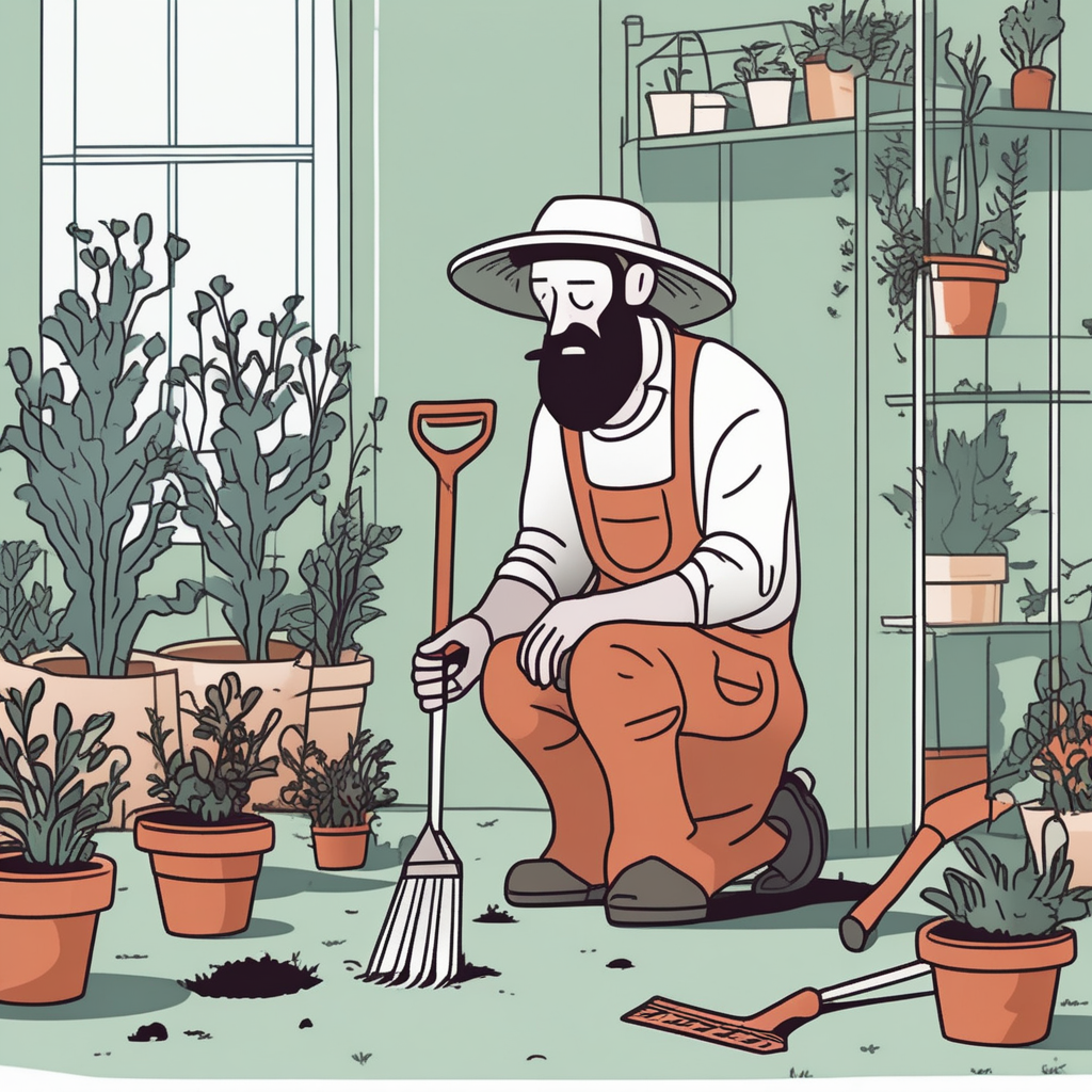 He groans at weeds that have grown where tools were thrown