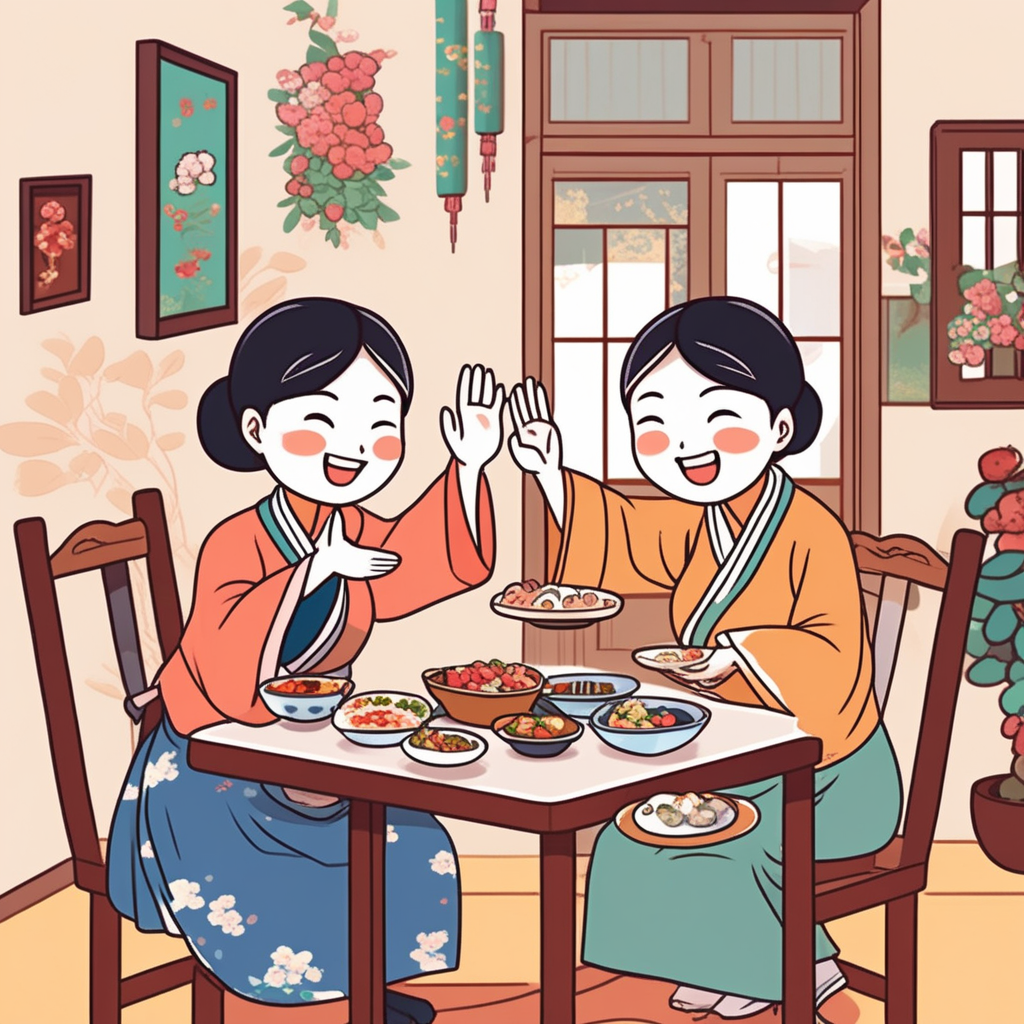Aunt ('인비') at the table gesturing an invitation with her hand!