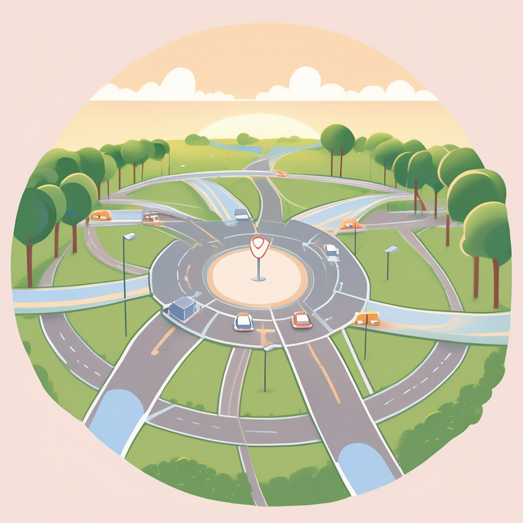 roundabout — A circular intersection where traffic flows in one direction around a central island. Can also mean indirect or circuitous in approach.