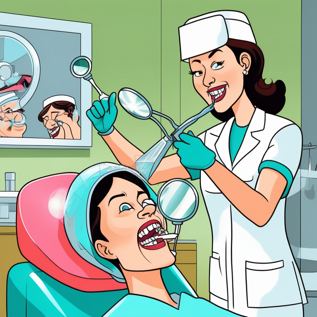 앞니 검사하는 치과 상담사, 바이저 쓰고 꼼꼼히!