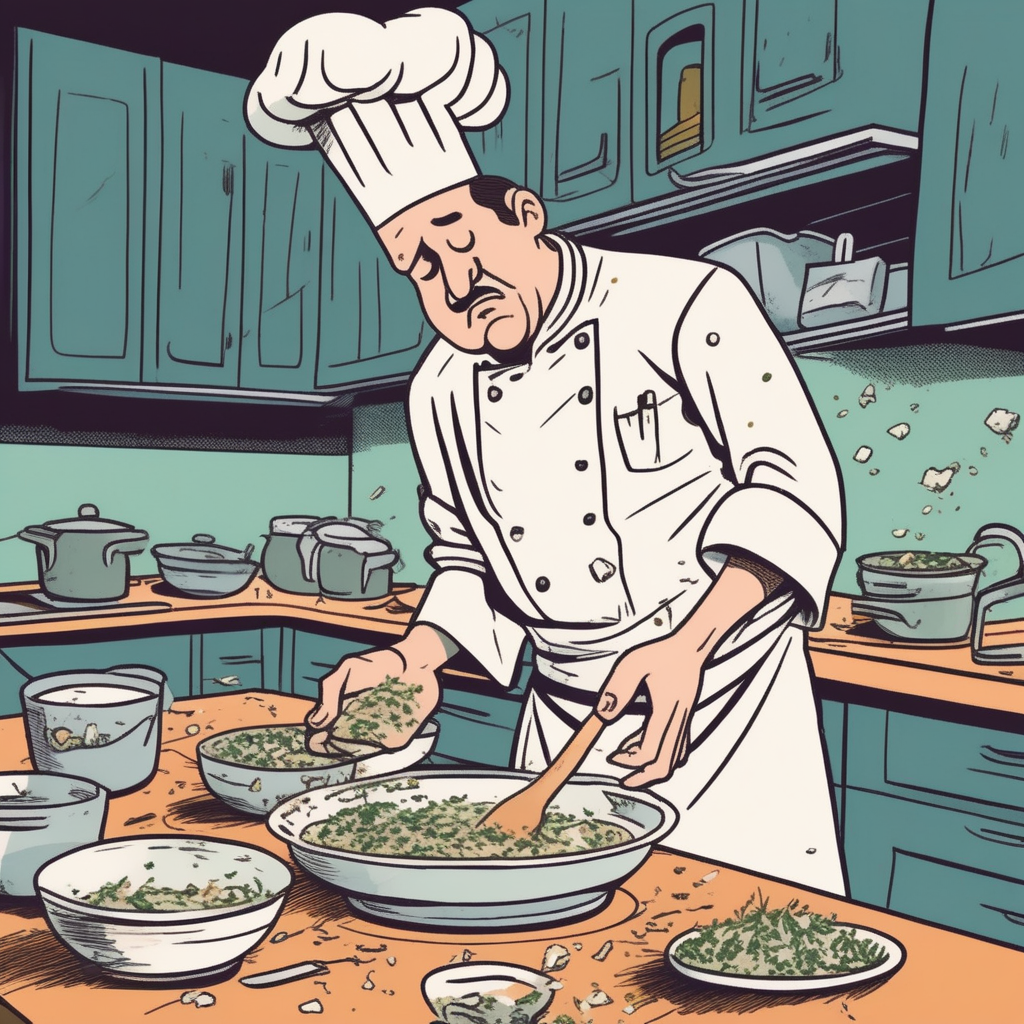 서둘러 요리하다, 허브는 뭉개지고 부스러기만 털어내네!