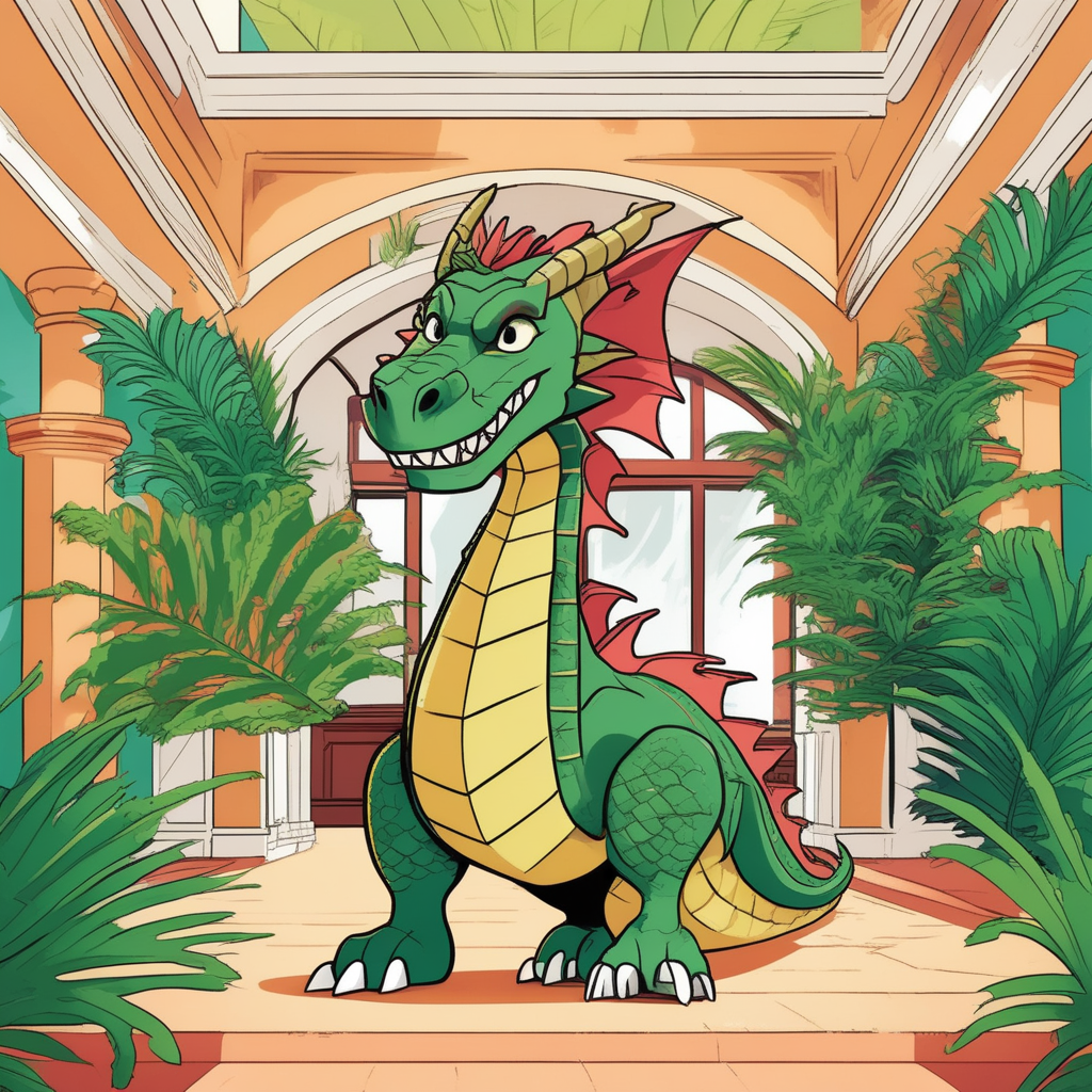 프론트 데스크의 드래곤이 거대한 야자수 잎을 자랑스럽게 내밀고 있어요!