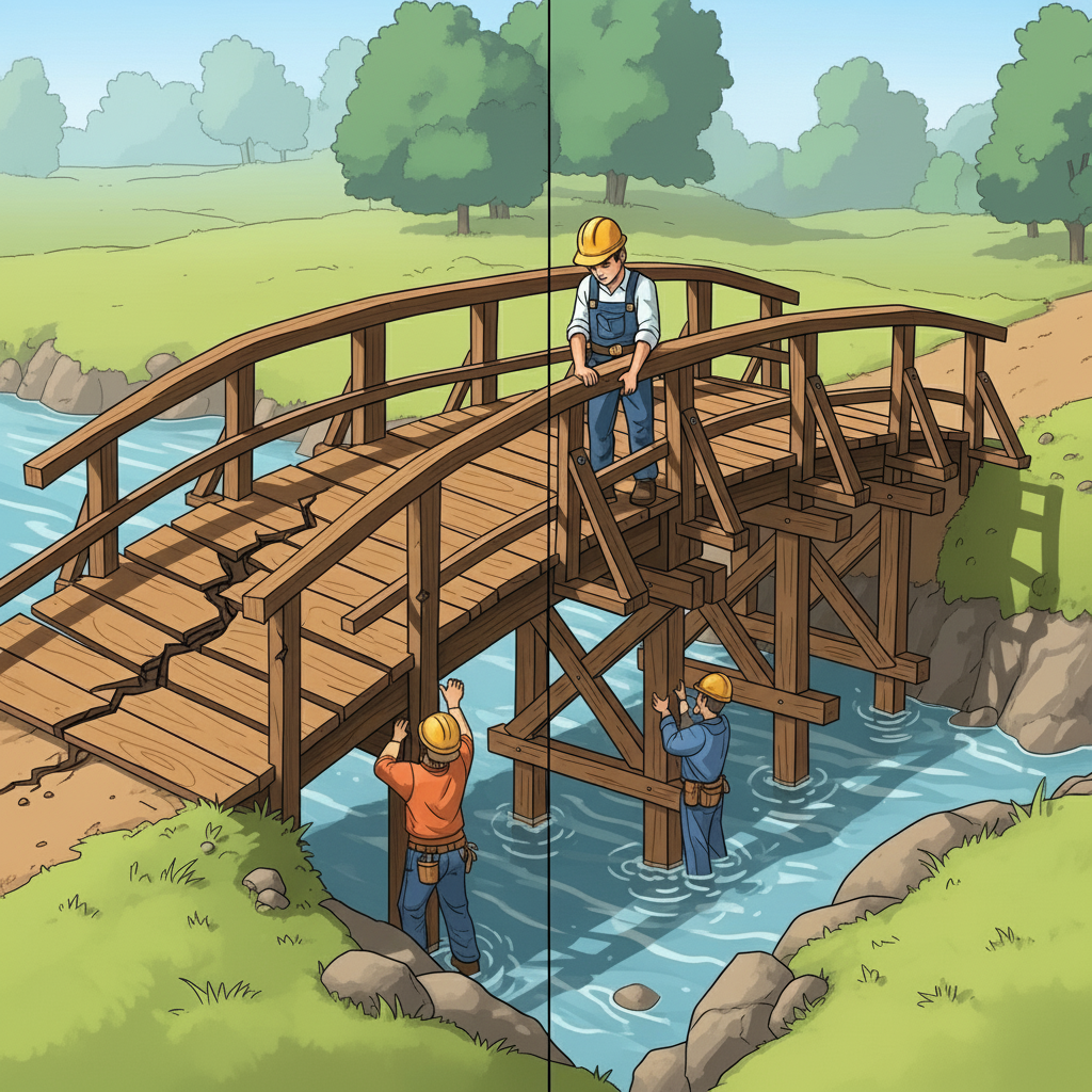 그는 추가 지지대를 설치해 다리를 더 튼튼하게 만든다.