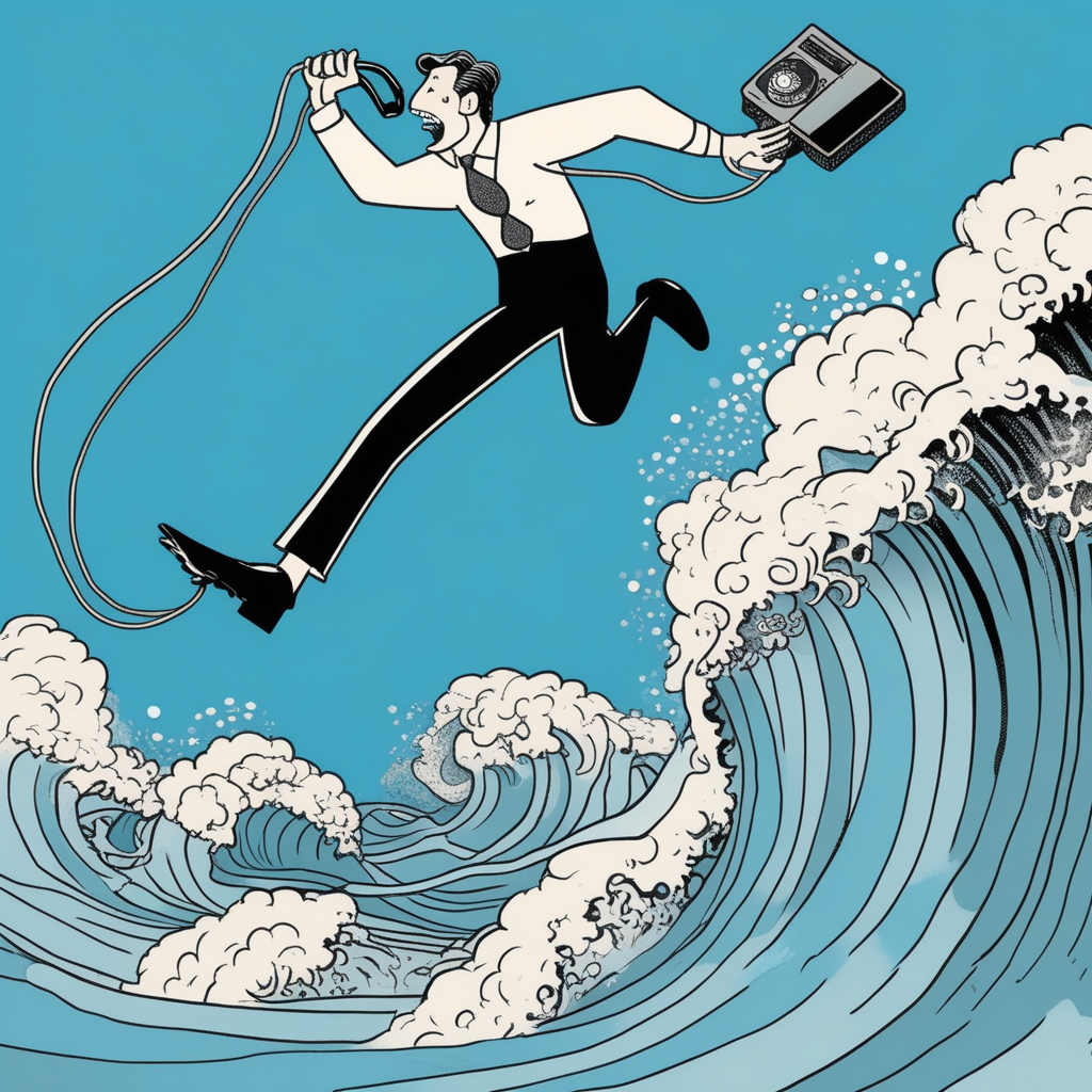 An overseas call in the hall makes his briefcase fall!