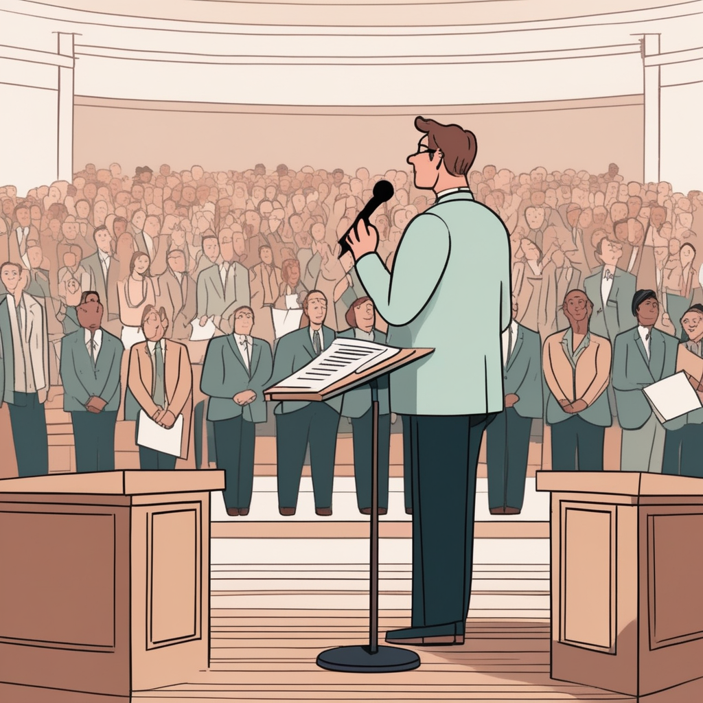 떨리는 손으로 연단에 서니, 아마도 용기를 모으는 중이리.