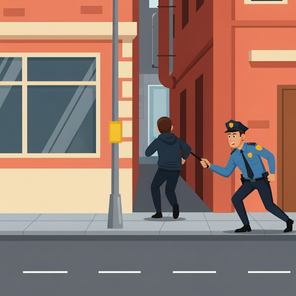 도둑이 추격 중 좁은 골목으로 재빨리 들어가 경찰을 따돌린다.