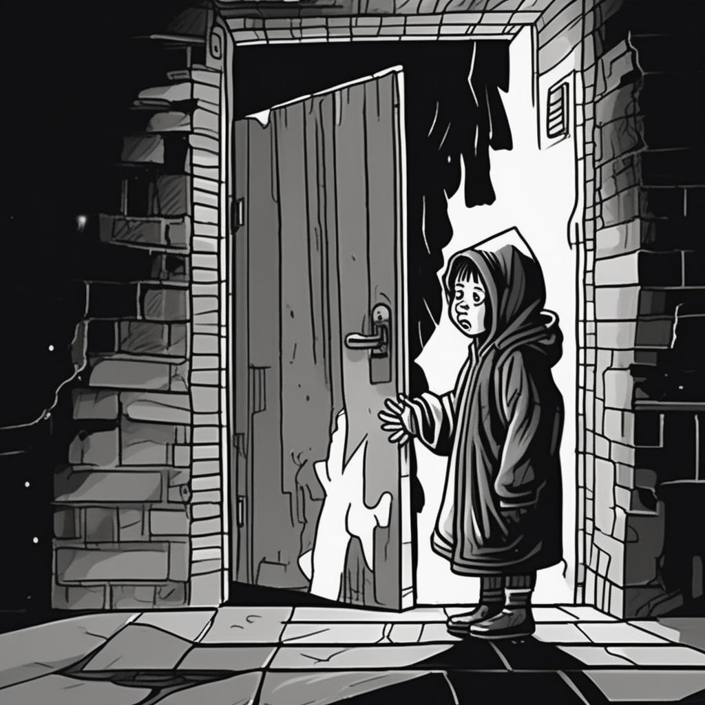 "The kind lady took the waif home and gave him a warm meal."