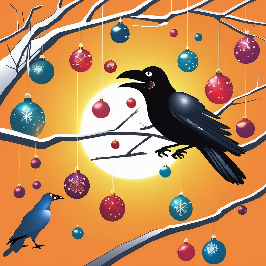 The crow tries to gobble the bauble, making the branch wobble!