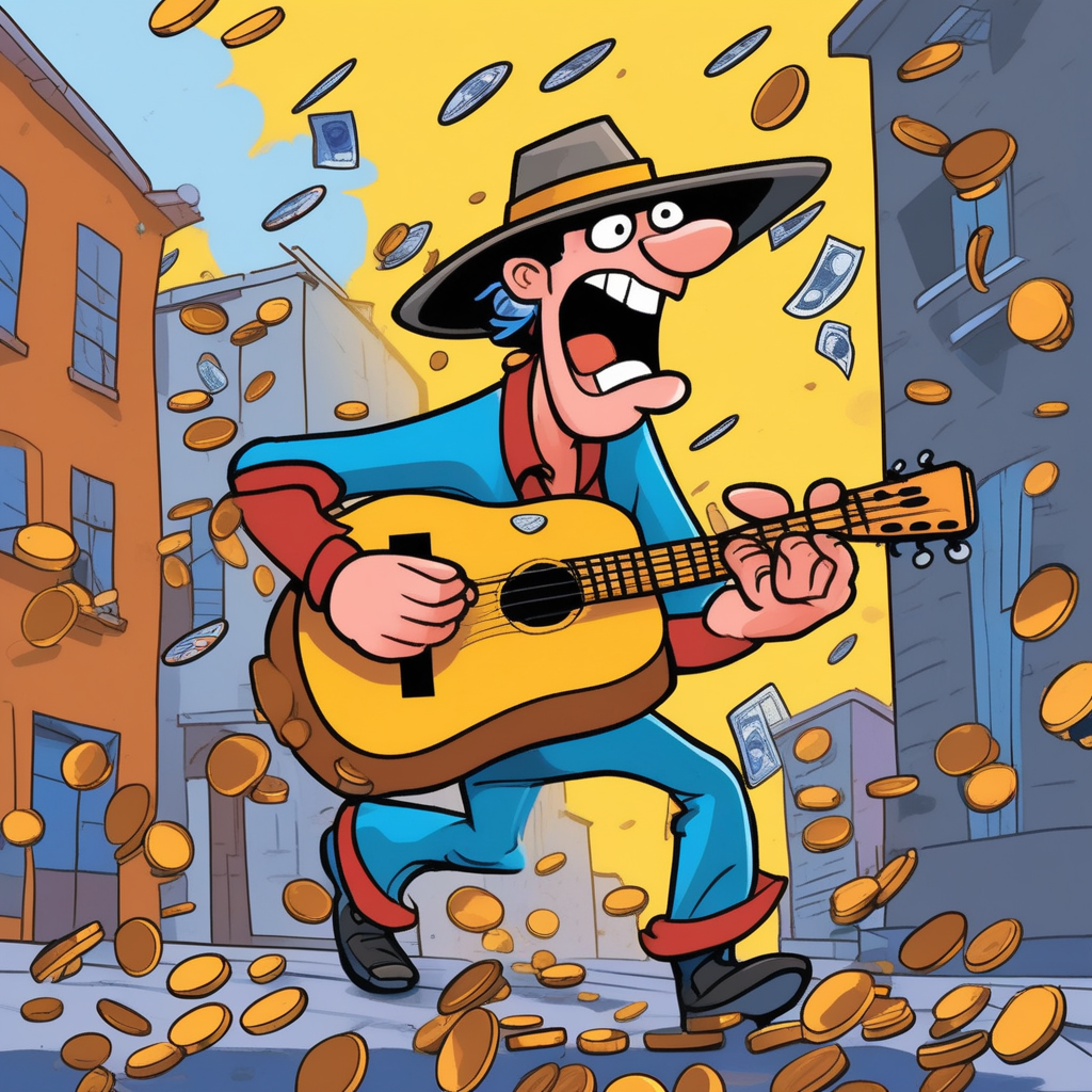 On this windy day, the skinny musician chases every flying penny!