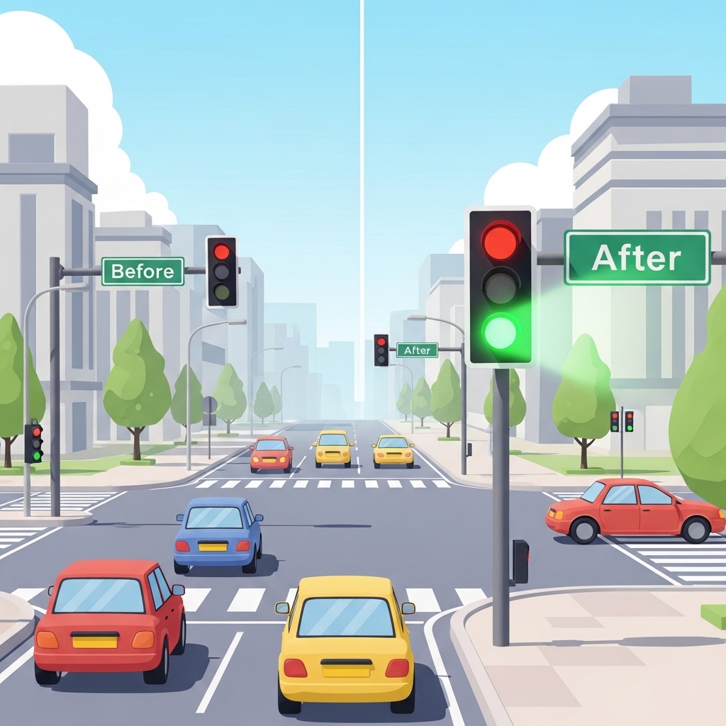 초록불 신호에 차들이 움직이기 시작하다