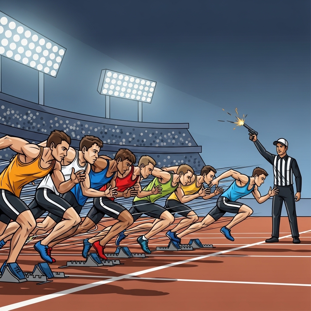 At the signal, every single runner launches forward and their footsteps mingle in a blur.