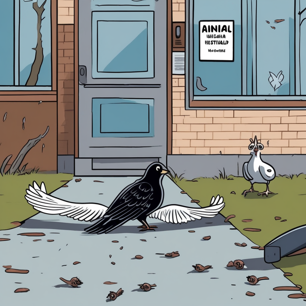 The bird with spread wings is tick-ticking pathetically in front of the clinic!