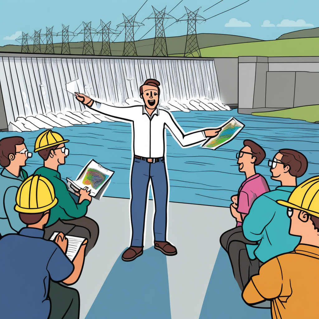 Hi! Drawing teacher giving a lecture about hydroelectric dam!