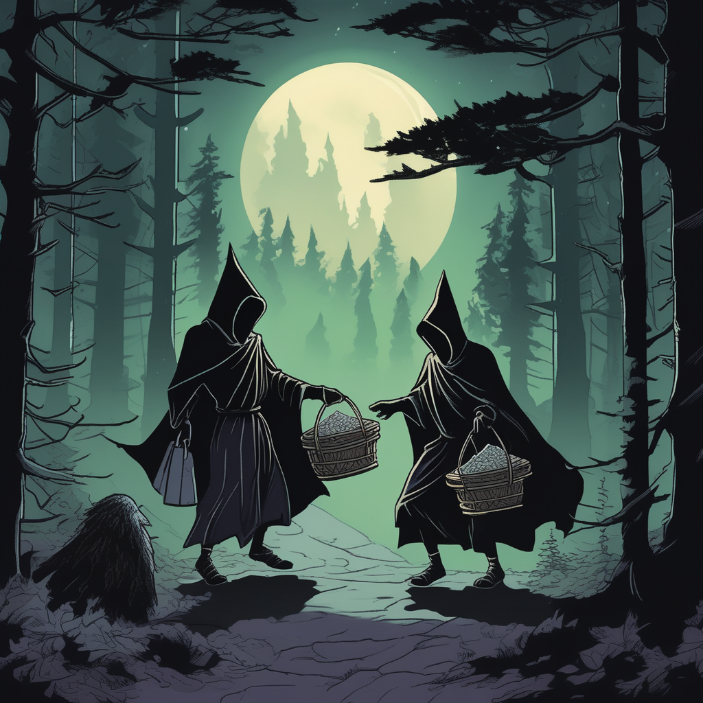 후드 쓴 상인들, 숲에서 물건을 거래하네!