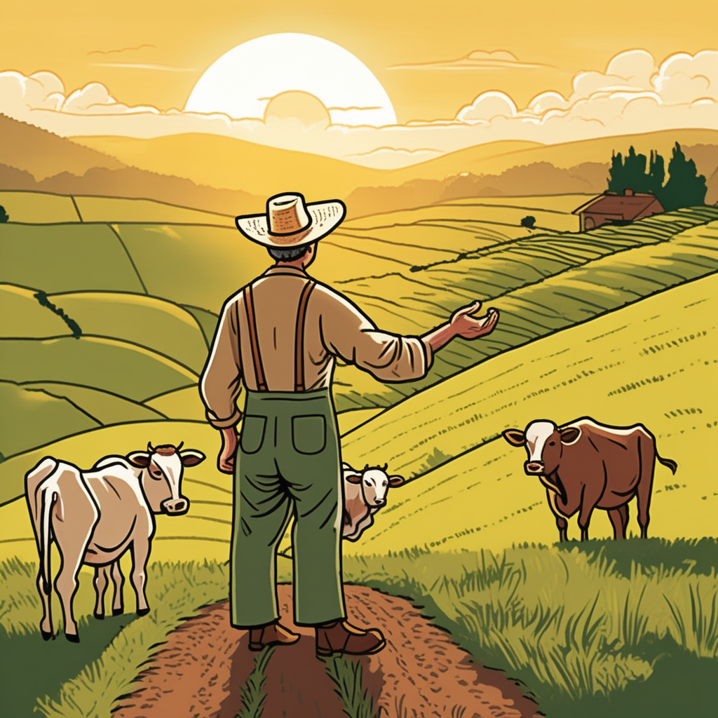 His hand points to pasture, where cattle roam the pastureland