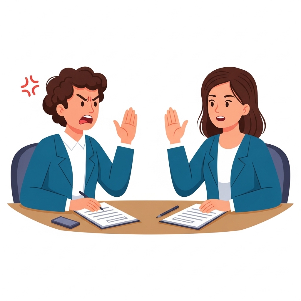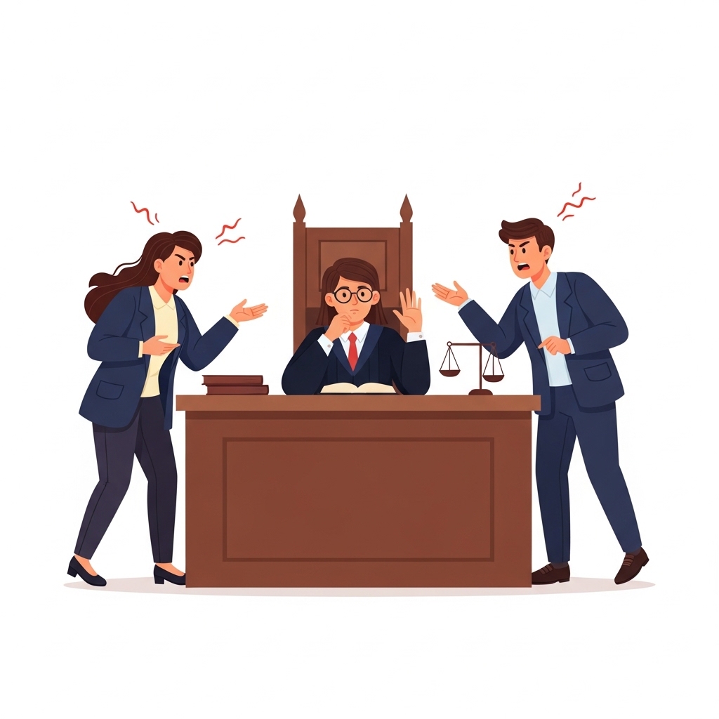 판사가 양쪽의 주장을 모두 듣고 침착하고 합리적인 판단을 내린다.