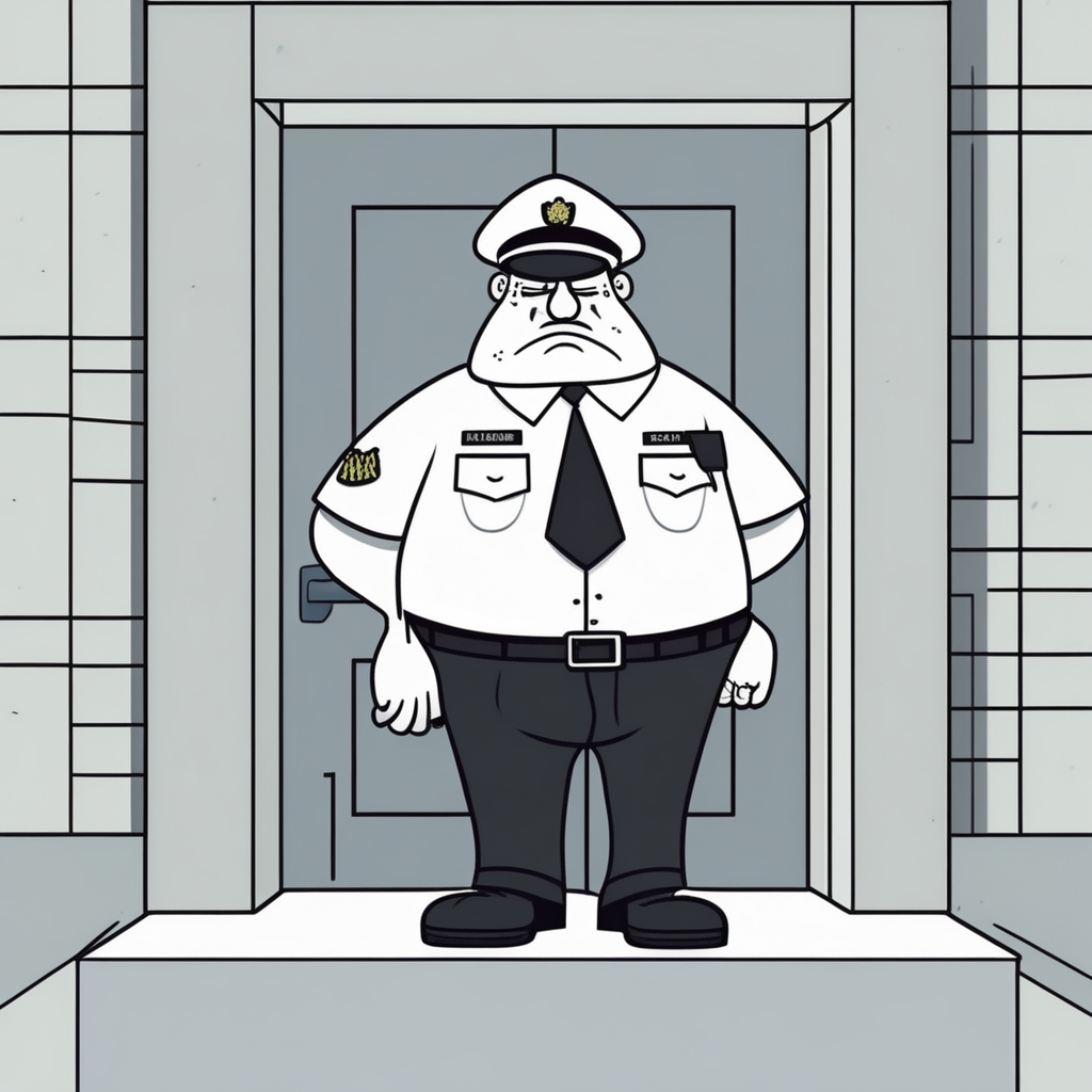 The sour-faced guardsman protects the entrance! A security guard's occupational hazard?