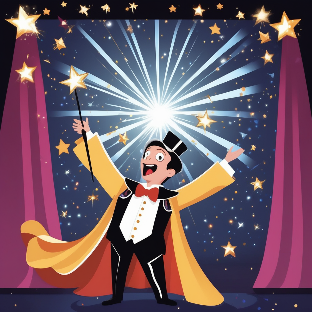 The magician waves his wand completely dramatically!