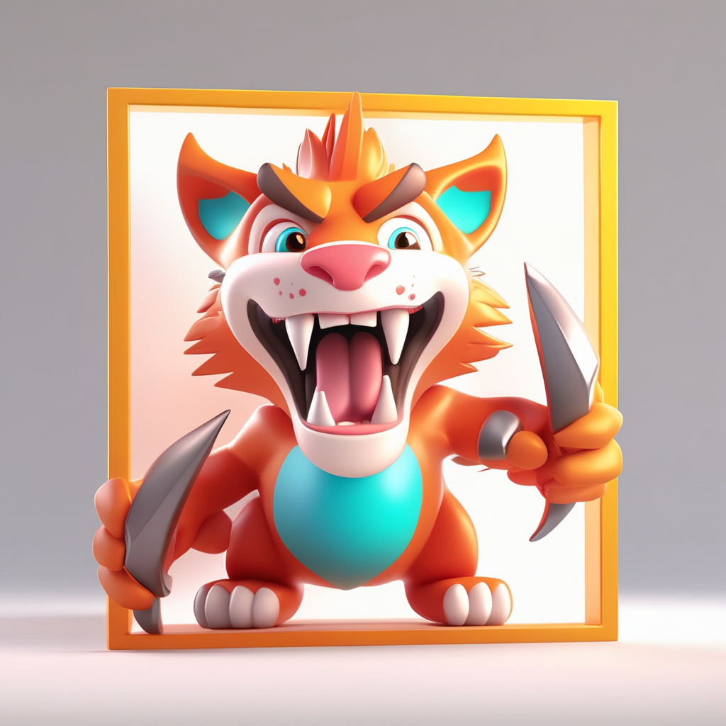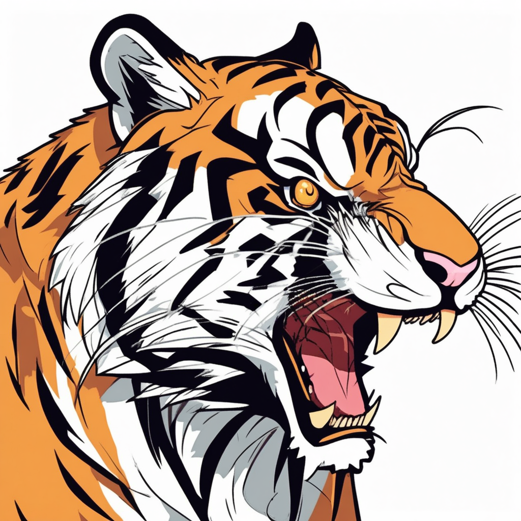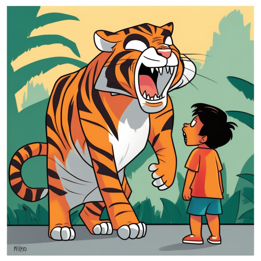 영리한 아이가 사나운 호랑이 앞에서 무모하게 으르렁거린다.