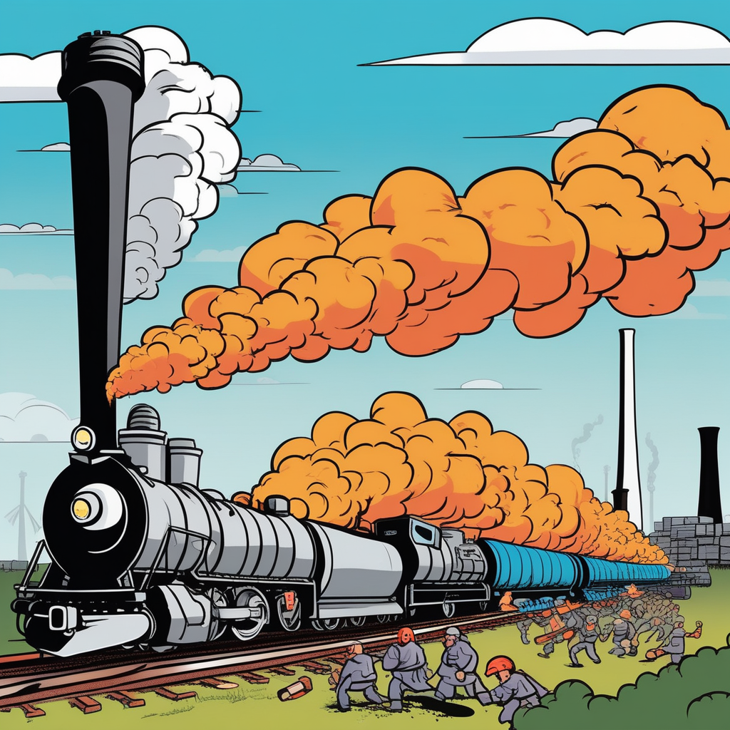 The smokestack billows while protesters attack the train on the track!