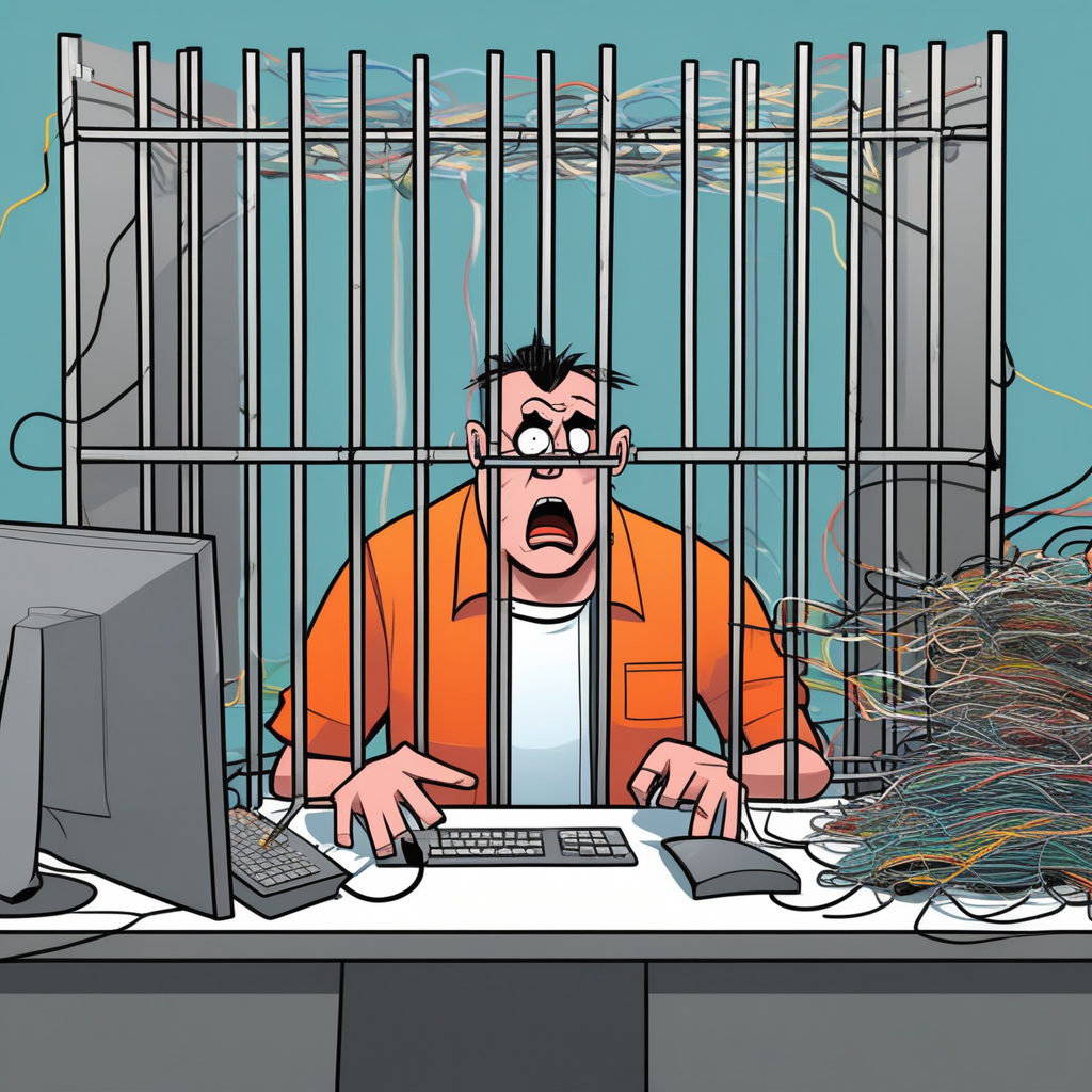 Engaged in work but caged, he becomes enraged!
