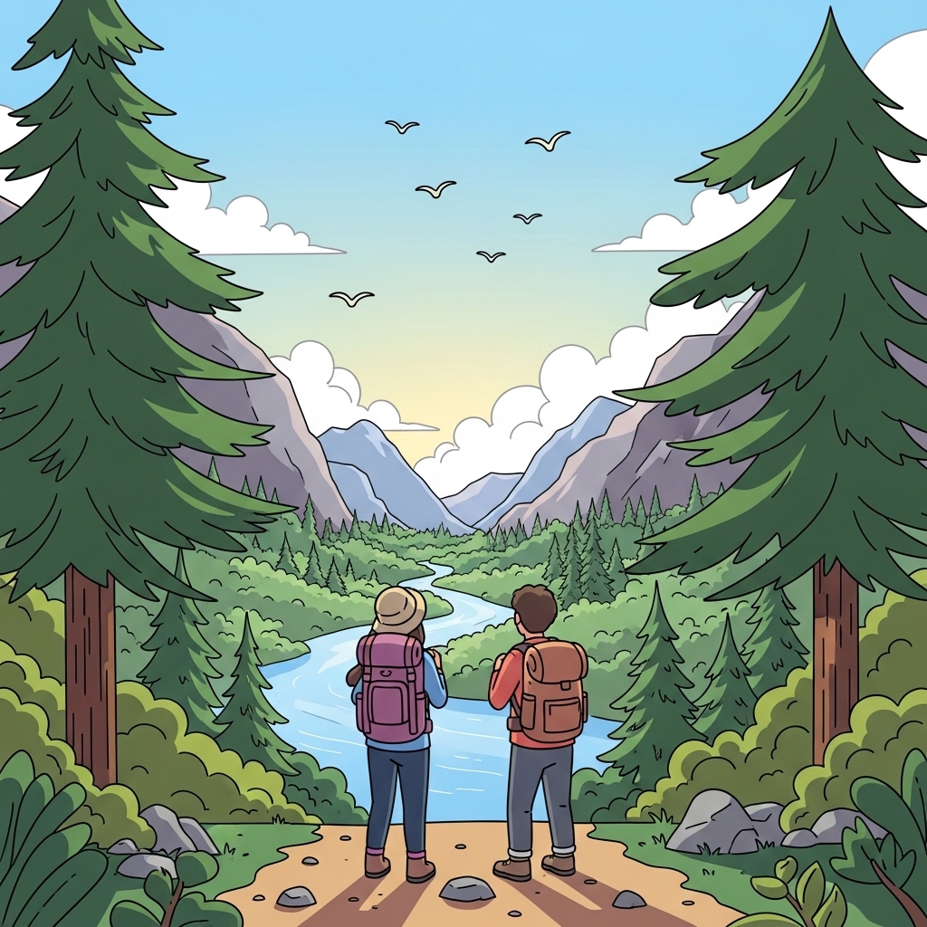 숲과 산, 강이 하이커들을 둘러싸며 자연의 모습을 보여준다.