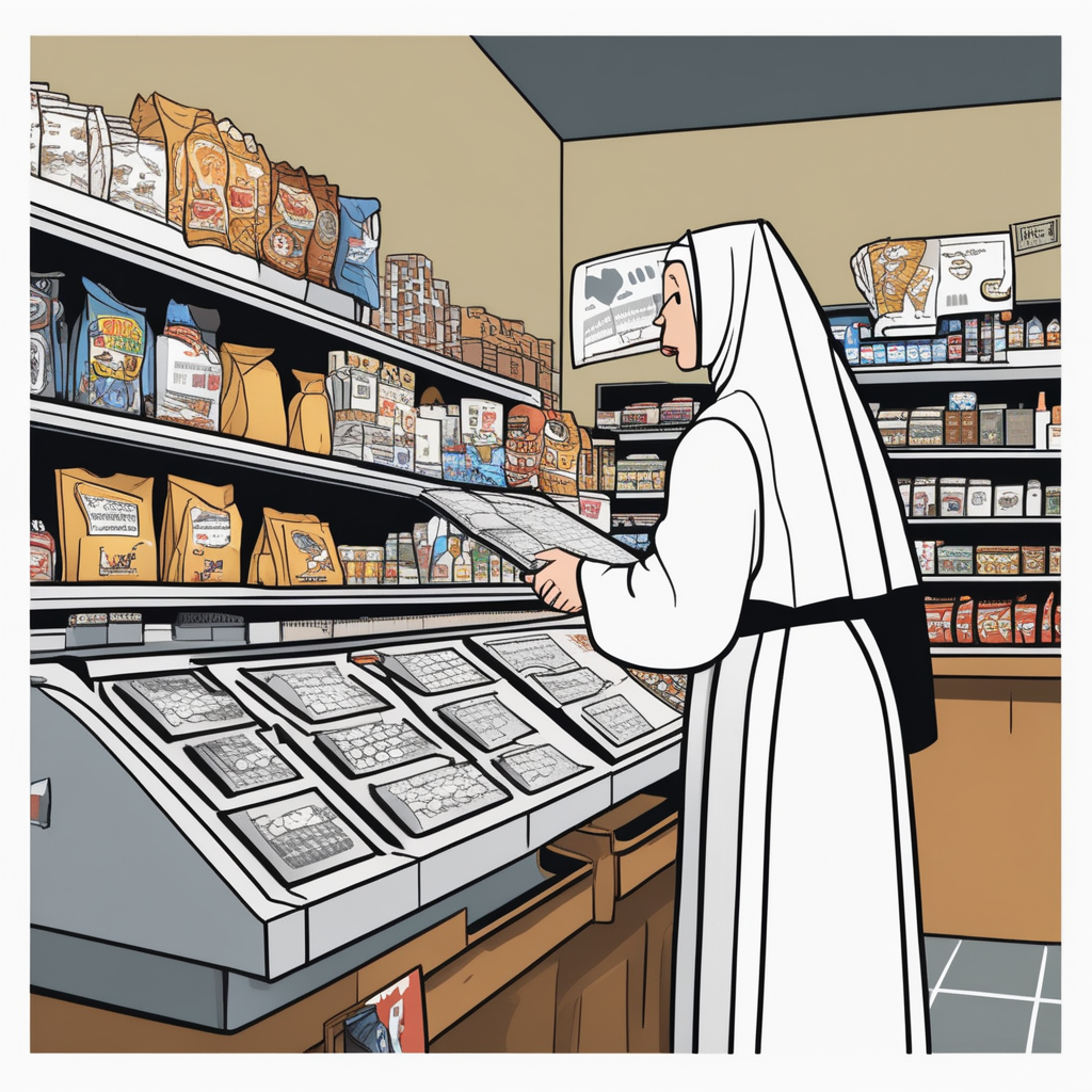 레지 수녀님이 계산대에서 모든 물건을 꼼꼼히 등록 중!
