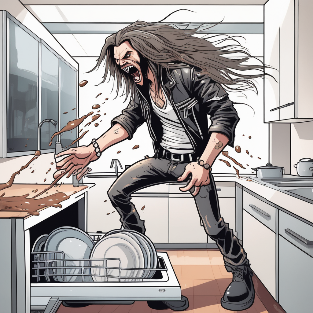 식기세척기 앞의 메탈헤드, 설거지도 락앤롤!
