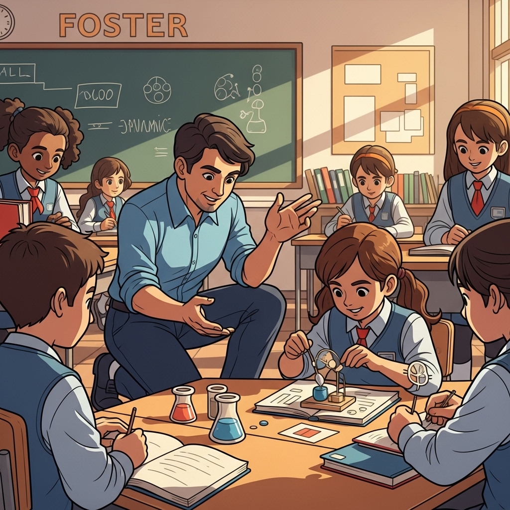 선생님은 학생들이 새로운 생각을 탐구하도록 격려하며 호기심을 키운다.